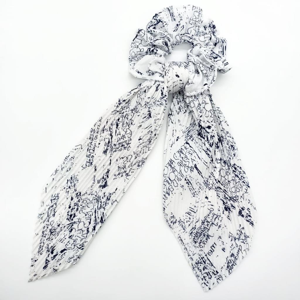 Karışık İnce Yazı Desenli Beyaz Simitli Fular Toka